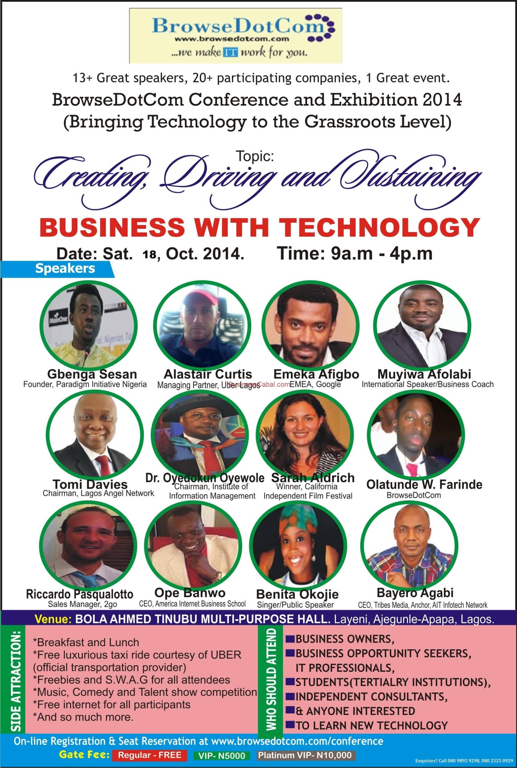 “We have the pleasure of inviting everyone with an interest in all areas of technology as this conference will give them unlimited access to inside information and key individuals in this sector. Due to limited seats, we would recommend all participants to pre-register at http://browsedotcom.com/conference in order to secure a seat as well as arrange transportation courtesy of UBER our official conference taxi partners whom are providing all participants with a free luxurious taxi ride between N3,500 and N10,000 to and from the event. Whilst registration is free, there is however a special package for participants who would like to seated in our VIP section.”