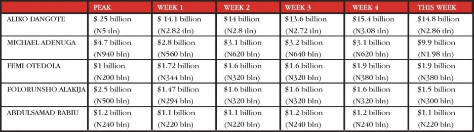 Nigeria’s four other richest persons – Alhaji Aliko Dangote, Femi Otedola, Mrs. Folorunsho Alakija and Alhaji Abdulsamad Rabiu – recorded losses, except Otedola who retained his net-worth.