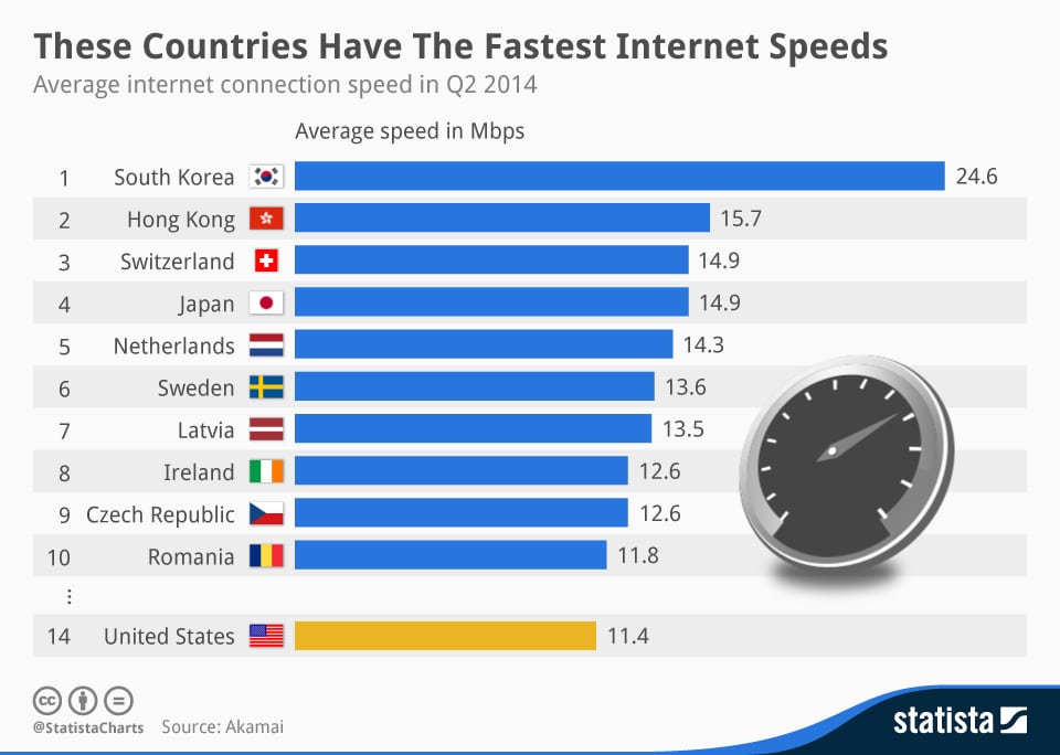 As of May 2015, they are about 70 million internet users in Nigeria and 13 million active social media accounts. Lagos state reportedly boasts of the fastest internet speed in Nigeria with about 4.08Mbps (Megabits per second). Abuja comes next with an average of 3.34Mbps, and all the other states are little behind. If you think that is fast, then this article on the top 10 countries with the fastest internet connection will surprise you. The no 10 country on this list has an average internet speed of 12.1Mbps! Nigeria is no way near this at all